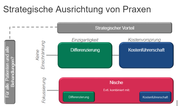 Beide Strategien, sowohl in Schwerpunkt oder Nische, können mit dem Ansatz einer Kosten- oder Preisführerschaft oder auch mit einer Differenzierungsstrategie kombiniert werden. Ein typisches Beispiel: Dr. X legt einen Schwerpunkt auf Implantologie und forciert das Wachstum durch konsequente Optimierung der Abläufe und niedrigpreisige Implantate und Suprakonstruktionen, um Patienten implantologische Versorgungen zu niedrigen Kosten anbieten zu können.